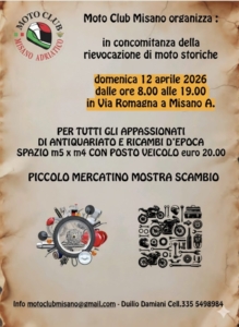 Il Moto Club Misano organizza una sfilata rievocativa con esposizione moto d’epoca, mostra scambio moto e ciclo antiquariato.